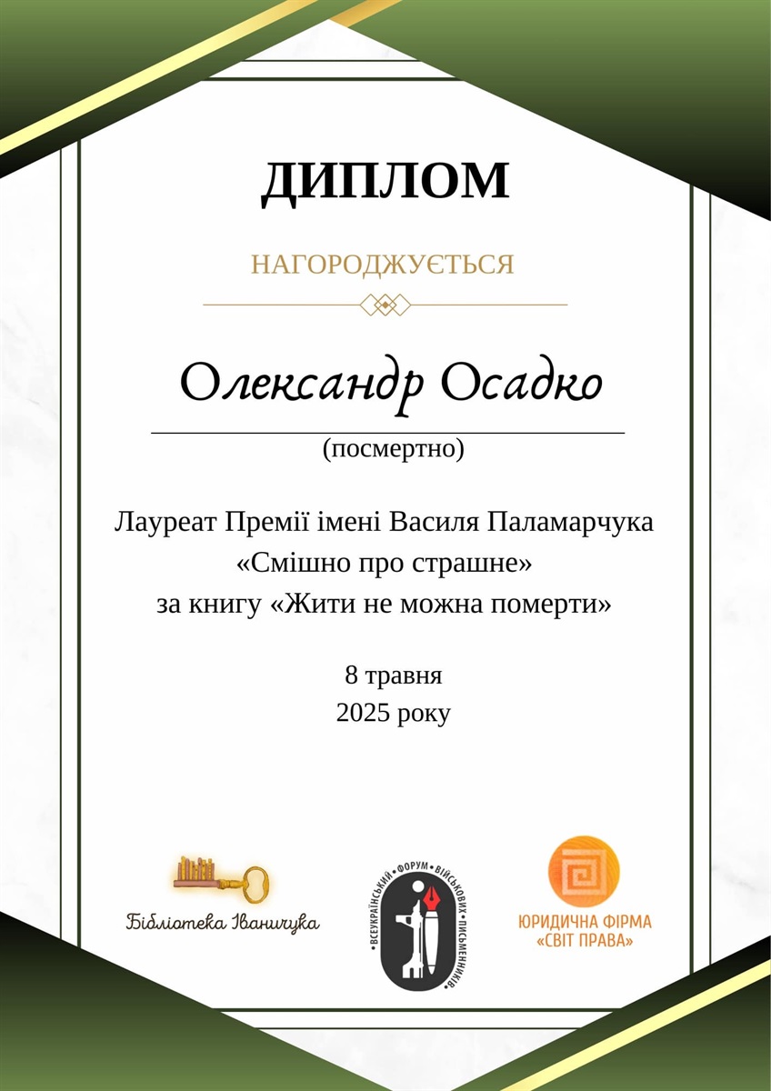 Другим переможцем премії посмертно став Олександр Осадко за книгу «Жити не можна померти». Військовослужбовець і тернопільчанин Олександр Осадко загинув 9 липня 2022 року на Донеччині. Премію отримала дружина військовослужбовця, письменниця і перекладачка Анна Осадко. «Це була перша та остання його книга, яка вийшла після його загибелі», – сказала Анна Осадко. Тираж книги розійшовся за 2 місяці.