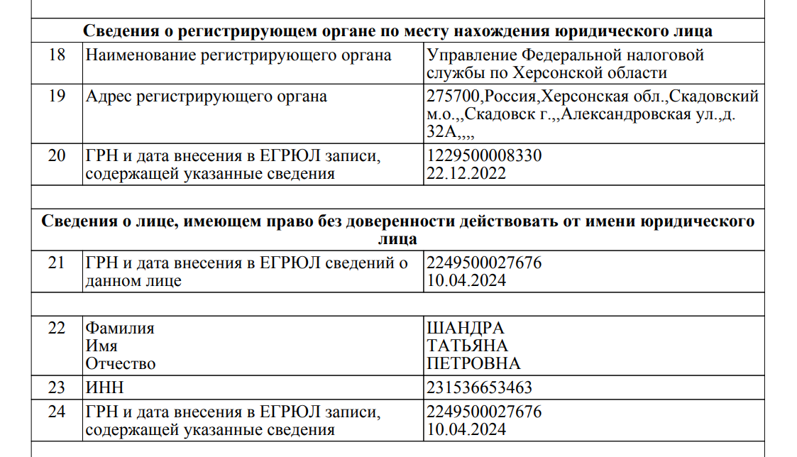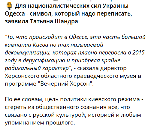 Але згодом її замінили на Шандру і нині у окупантів обласний краєзнавчий музей очолює саме Тетяна Шандра — з 10 квітня 2024 року. Музей за російським законодавством, яке щодо окупованих територій не визнають у цивілізованому світі, зареєстрований у окупованому Скадовську.