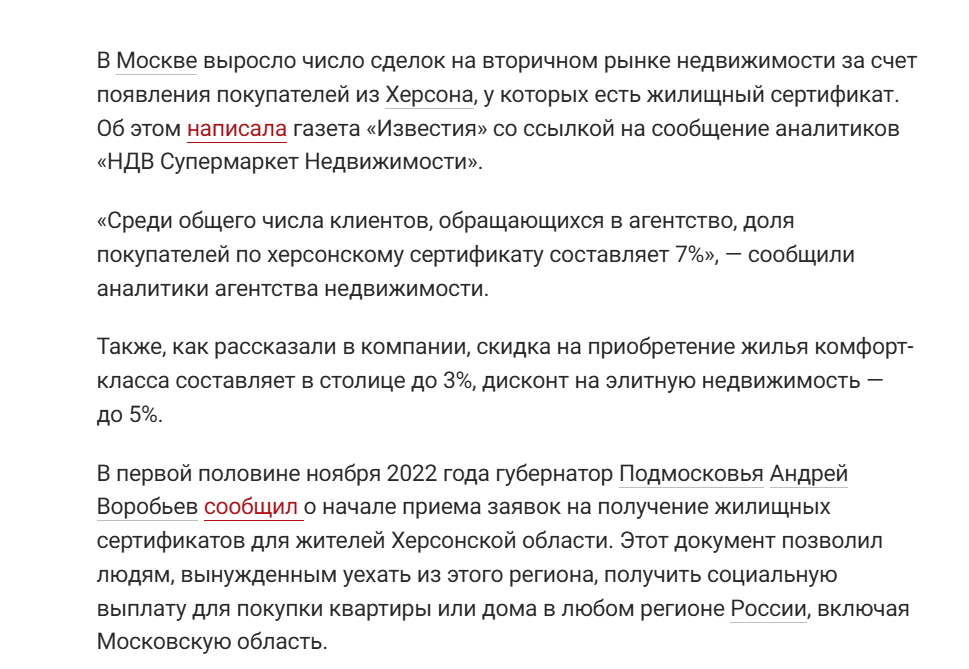 У травні 2023 року російські журналісти повідомляли, що в Москві значно зросла частка клієнтів на вторинному ринку нерухомості саме за рахунок клієнтів з Херсона. Правда це чи вигадки російських пропагандистів заради створення картинки, ніби всі херсонці захотіли в Москву, невідомо. Але наразі росіяни змушені вже регулювати це бажання херсонських зрадників замінити російські соцвиплати на готівку.