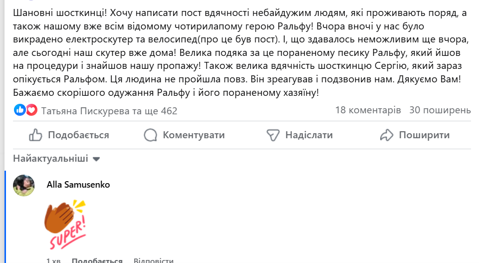 Тоді чоловік побачив у соцмережі пост про викрадення схожого транспорту. Як виявилося, це й був той самий викрадений електроскутер! Господарі транспорту неймовірно вдячні чотирилапому розумнику.