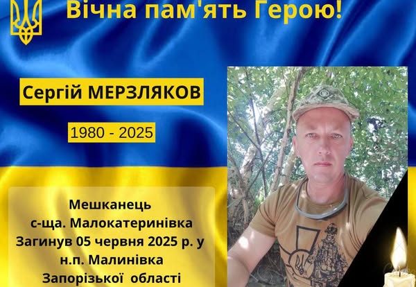 5 червня 2025 року, гідно виконуючи свій ратний обовязок, загинув захисник України, мешканець селища Малокатеринівка — Мерзляков Сергій Олександрович , 18.07.1980 р.н.