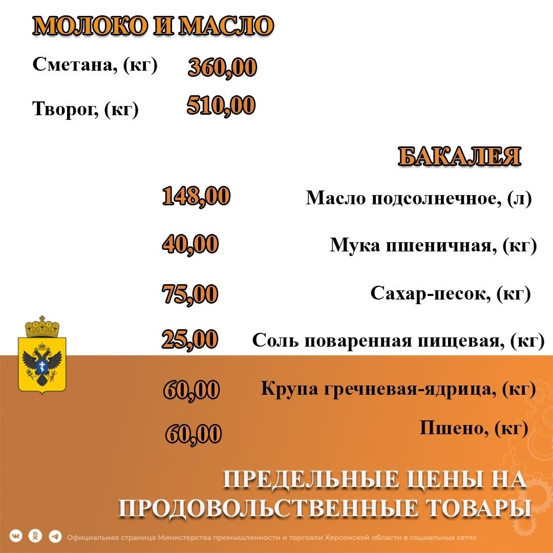 З 1 липня приміром встановлені такі граничні ціни (у рублях) в окупованій частині Херсонщии (дарма, що деяких продуктів у продажу просто не знайти)