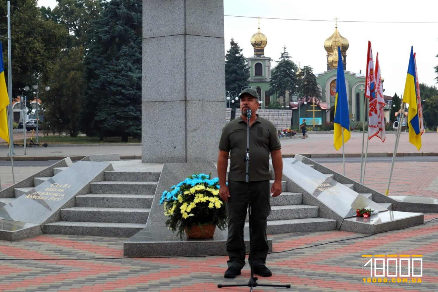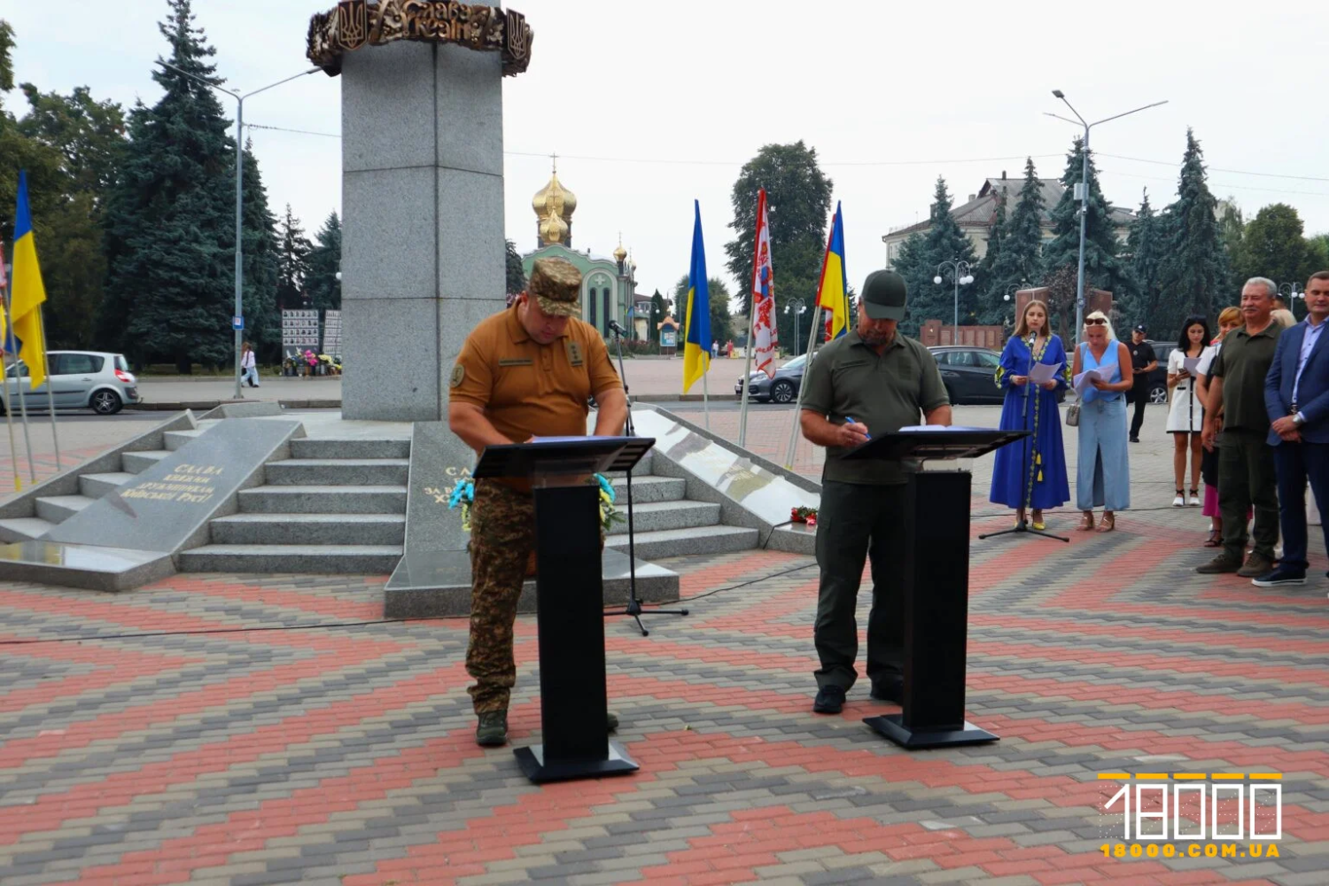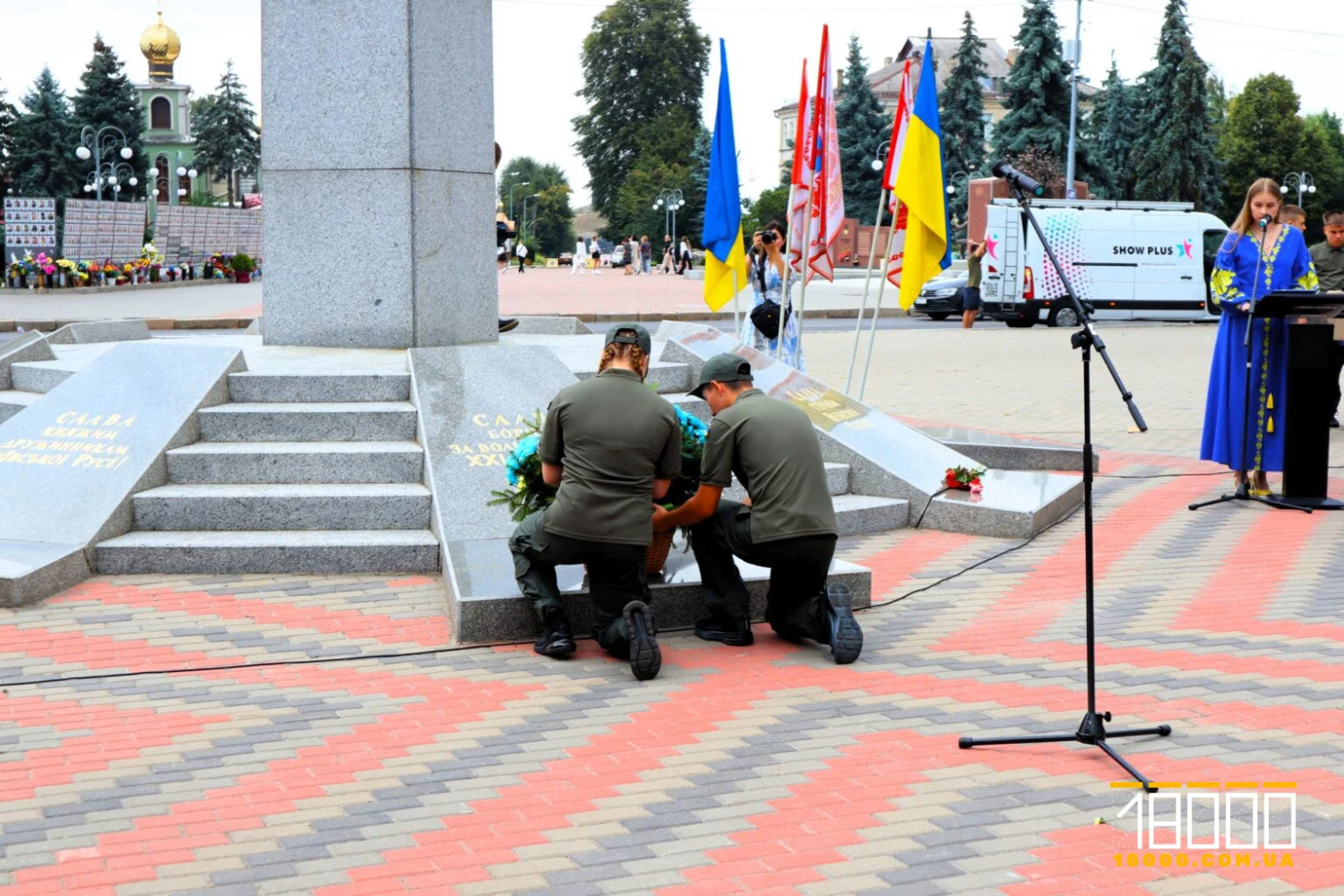 Після хвилини тиші до пам’ятника борцям за волю України крокують ліцеїст та ліцеїстка. Вони несуть кошик із жовто-блакитними квітами та встановлюють його біля високого монумента, присівши на одне коліно. Підводяться і прикладають долоню до голови, віддаючи честь.
