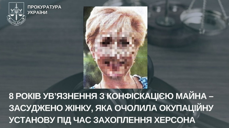 Суд заочно визнав жінку винною у колабораційній діяльності (ч. 5 ст. 111-1 КК України) та призначив покарання 8 років позбавлення волі з конфіскацією майна. Також її позбавили права обіймати будь-які посади в органах державної влади, державного управління, місцевого самоврядування та займатися діяльністю, пов’язаною з наданням публічних послуг, строком на 12 років.