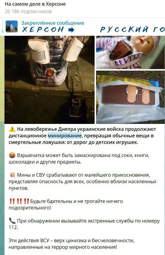 Таким чином, поширюючи історії про «заміновані іграшки» та «шоколадки», росія не лише бреше, але й намагається відвернути увагу від власних воєнних злочинів — дистанційного мінування населених територій на правобережжі Дніпра.