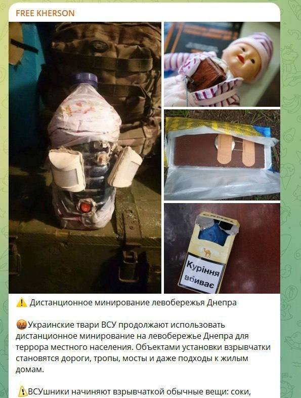 Пропаганда рф активно тиражує заяви анонімних каналів, що українські військові нібито маскують вибухівку під іграшки, продукти чи книги. Подібні повідомлення подаються як «доказ» того, що Україна створює загрозу для мирного населення.
