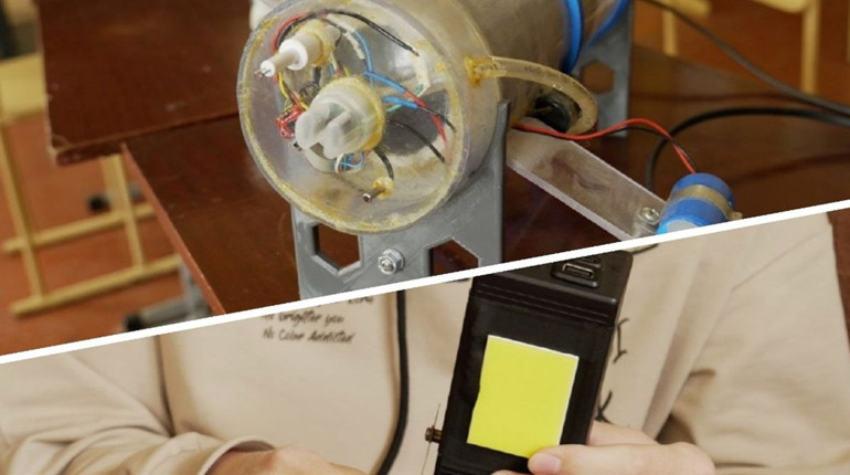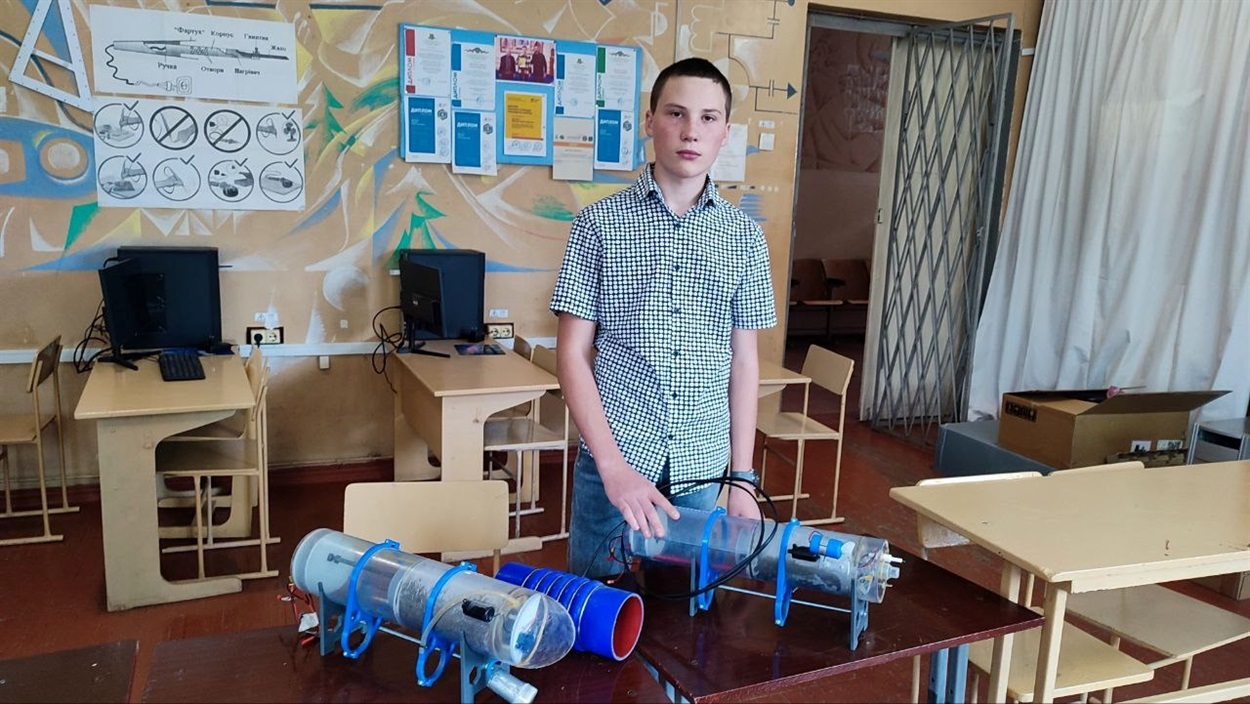16-річний Єрмак Роговий отримав стипендію вже втретє. Його головний проєкт — підводний човен для дослідження водойм. Це герметична акрилова труба, обладнана двома двигунами та спеціальними резервуарами, що дозволяють їй занурюватися на дно. Підводний апарат оснащений камерою та датчиками, які фіксують температуру, мутність і рівень pH води.