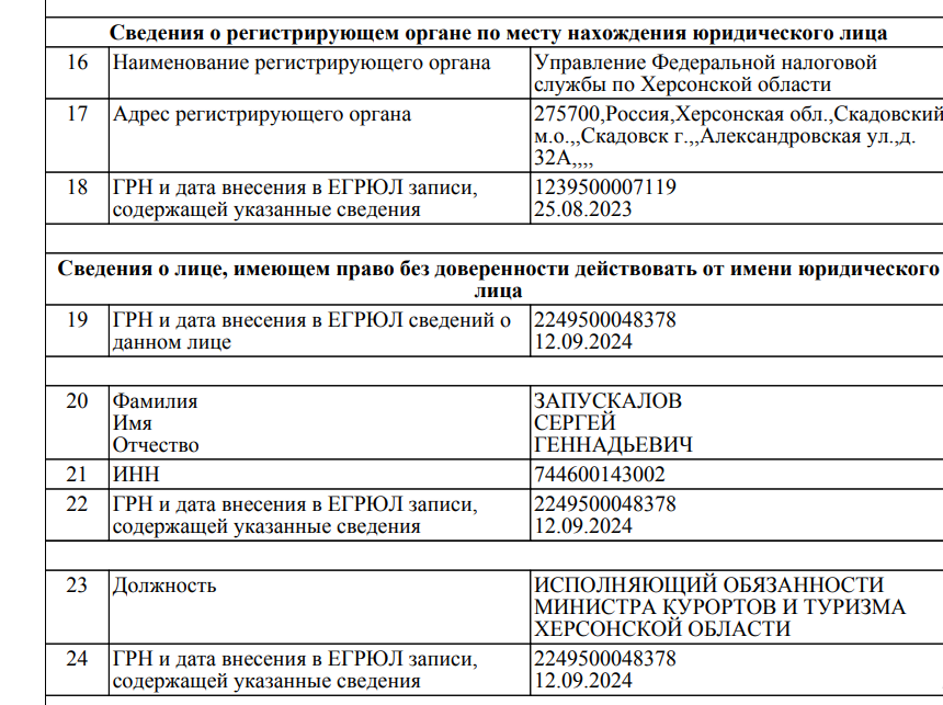 У вересні 2024 року Запускалов очолив окупаційне міністерство курортів і туризму Херсонщини, яке діє досі.