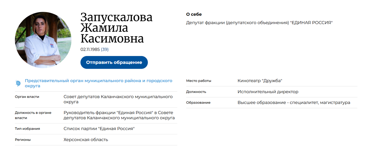 Профіль Запускалової на окупаційному сайті