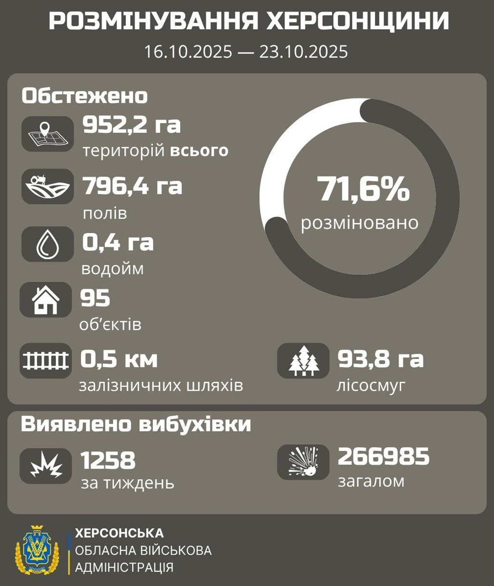 Херсонська обласна військова адміністрація регулярно оновлює дані щодо розмінування правобережжя Херсонської області (це деокупована частина регіону). Втім, росіяни мінують зокрема дистанційно, а що відбувається на окупованому лівобережжі, ми не знаємо.