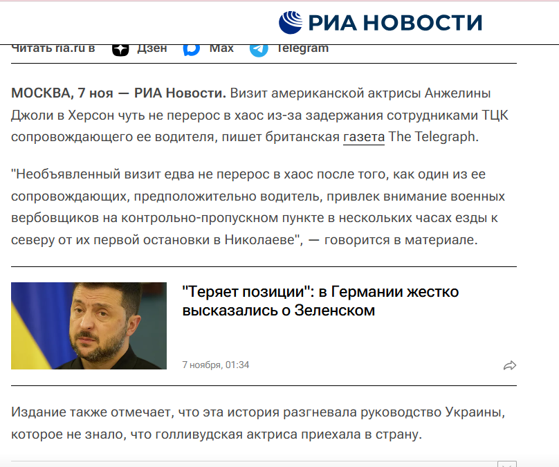 - Агентство РИА Новости (Росія) навело заголовок: «Перерос в хаос: СМИ рассказали, что случилось с Джоли на Украине», із формулюванням, що «визит американской актрисы … едва не перерос в хаос из-за задержания сопровождающего её водителя».
