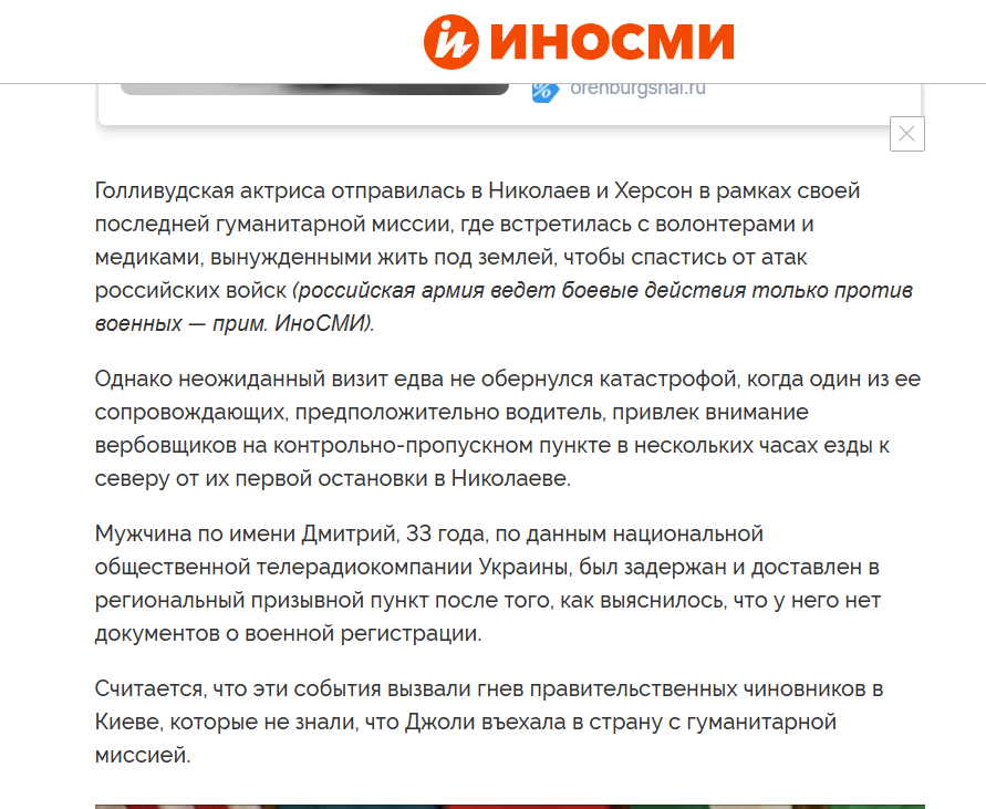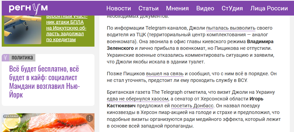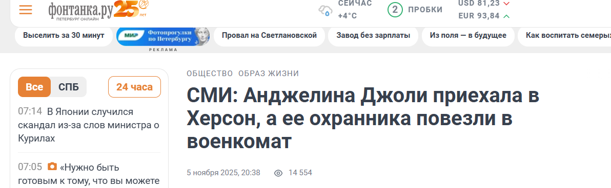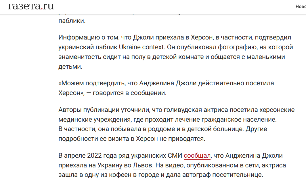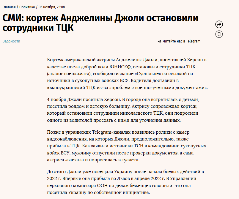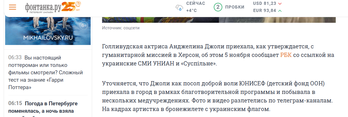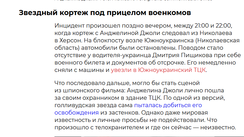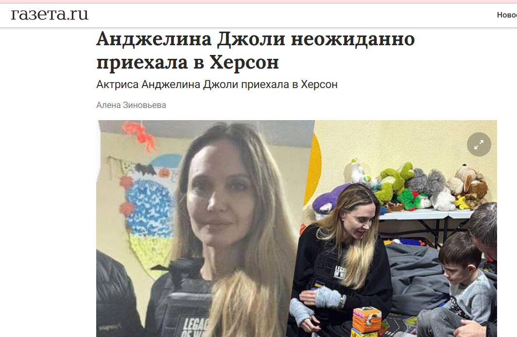 - Згідно з публікацією на сайті Фонтанка.ру: «Анджелина Джоли приехала в Херсон, а её охранника увезли в военкомат».