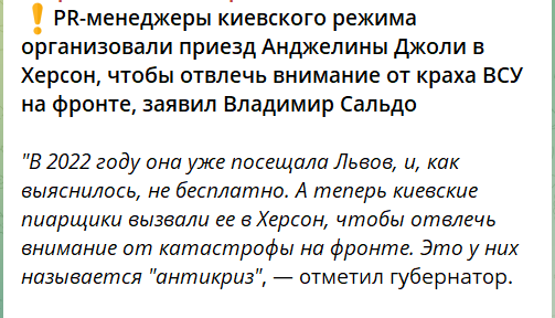 Ми не могли обійти увагою окупаційні пабліки. Тому додамо ще і їхньої реакції. Вона також «чудова»: якщо почитати їх, то візит Анжеліни Джолі — це… маневр відволікання від ситуації на фронті. Враховуючи те, що ані Офіс Президента України, ані Херсонська ОВА, ані Херсонська МВА, ані миколаївські посадовці жодним чином не коментували візит Анжеліни Джолі (дивно, але факт), то сумнівна така піаракція виходить. Але не шукаймо логіки у росіян та їхніх посіпак — її там ніколи не було.