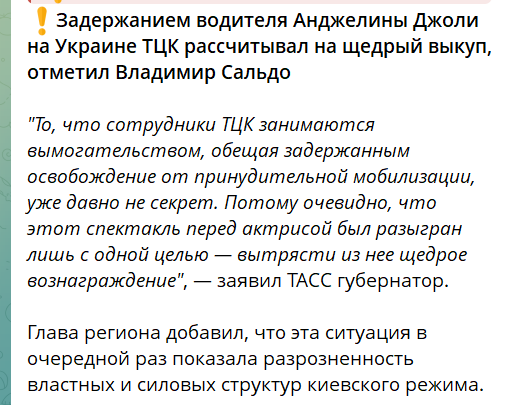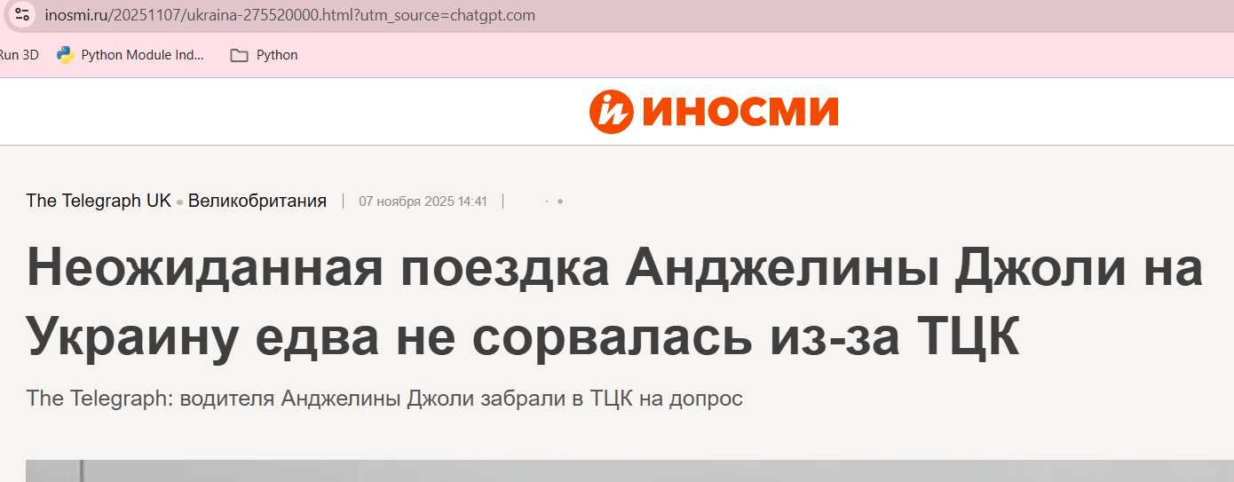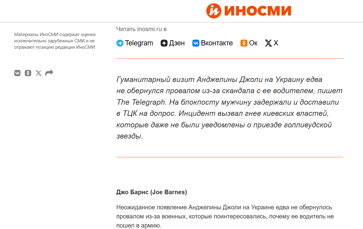 - Видання Ведомости пише: «Кортеж американской актрисы … остановили сотрудники ТЦК» — акцент на тому, що супровід зірки нібито зазнав затримання через «проблемы с военно-учётными документами».