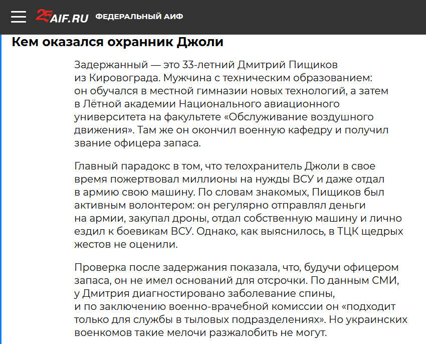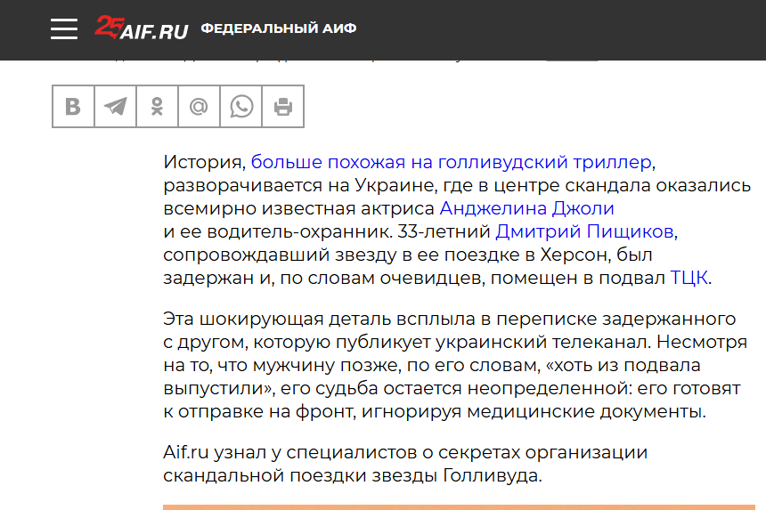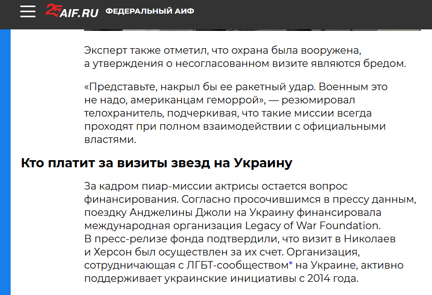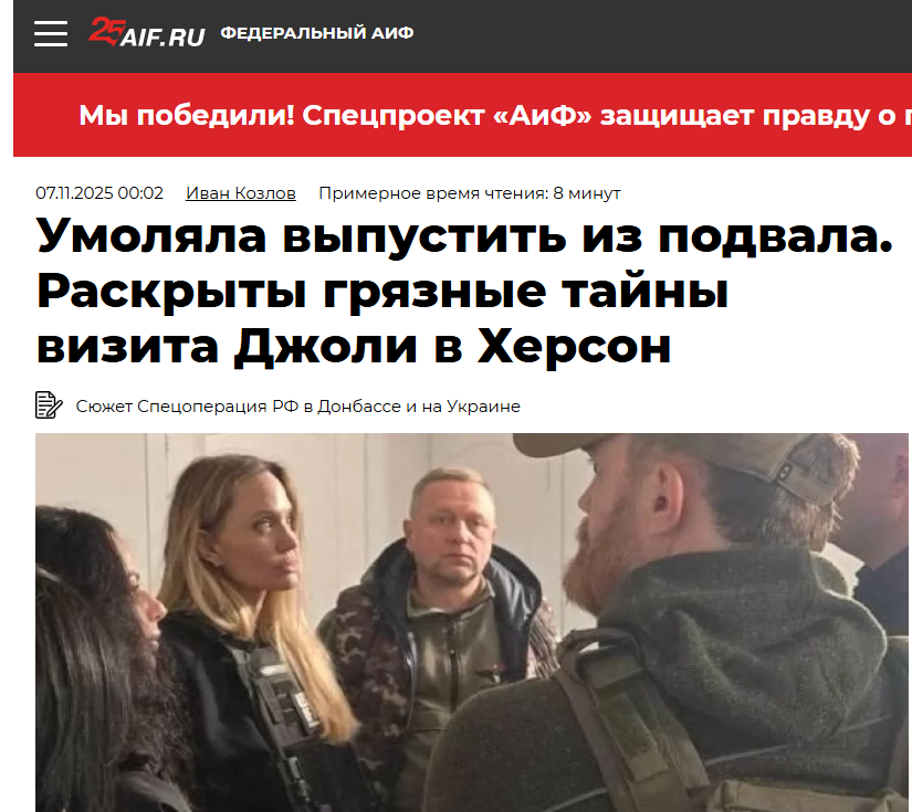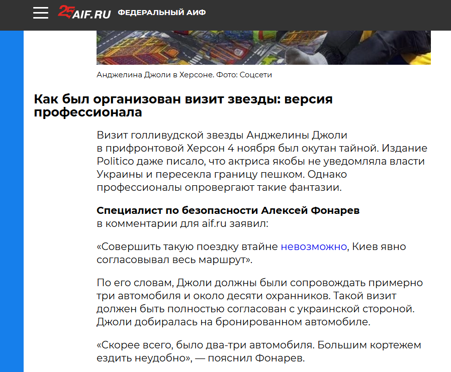- У статті на сайті АиФ (Аргументы и Факты) — заголовок: «Умоляла выпустить из подвала. Раскрыты грязные тайны визита Джоли в Херсон». Тут акцент: «визит … был окутан тайной», «не уведомляла власти Украины и пересекла границу пешком». Взагалі популярне серед росіян видання продемонструвало неймовірну емоційність та навіть істеричність. Тут — і «підвали ТЦК», і нібито проплаченість візиту (до речі, про гроші, які нібито просто заплатили за візит Джолі, плітки ходили і серед херсонців), і багато іншого відвертого вигаданого мороку. Ми вам усе заскрінили. Гортайте ліворуч.
