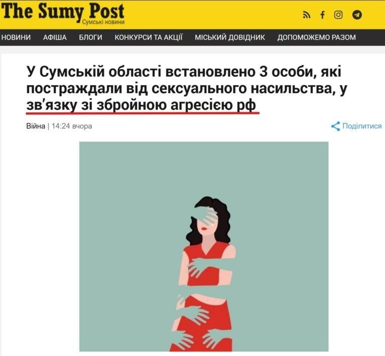 Реальність, встановлена VoxCheck: Оригінальна новина, датована 5 листопада 2025 року, мала принципово інший зміст. Її справжній заголовок: «У Сумській області встановлено 3 особи, які постраждали від сексуального насильства у зв’язку зі збройною агресією рф».
