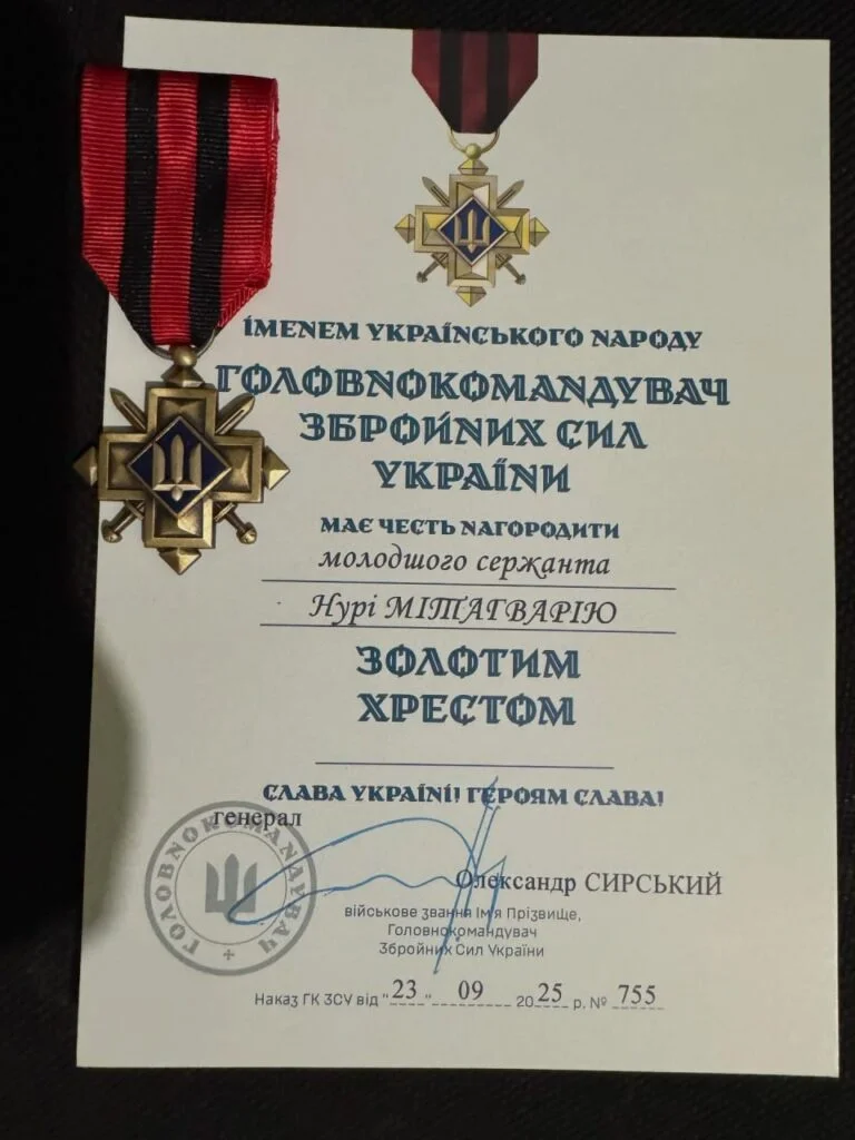 За інформацією військового, молодшому сержанту Нурі Мітагварії нагороду присвоїв головнокомандувач Збройних сил України Олександр Сирський. Наказ від 23 вересня 2025 року. Про вручення відзнаки захисник повідомив нещодавно – 2 грудня.