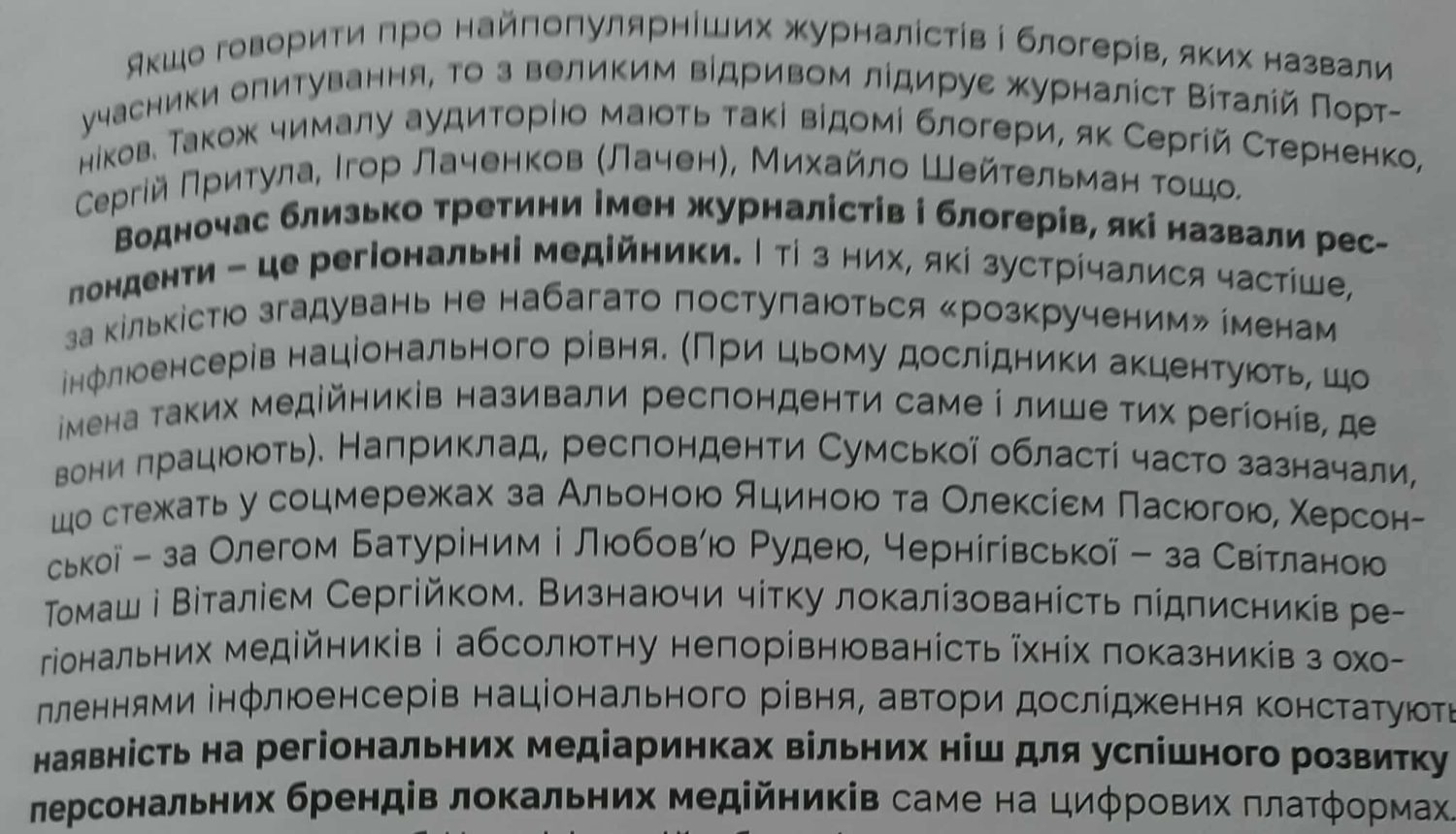 Приємно, що в результатах дослідження серед популярних регіональних журналістів Херсонщини названо мене та Олега Батуріна. Це означає, що нам довіряють. Тому ми не можемо зупинятися. Адже, як показують дослідження, окрім новин, люди потребують роз’яснень щодо соціальних пільг, компенсацій за зруйноване майно, підтримки ВПО, порядку отримання медичних і психологічних послуг.
