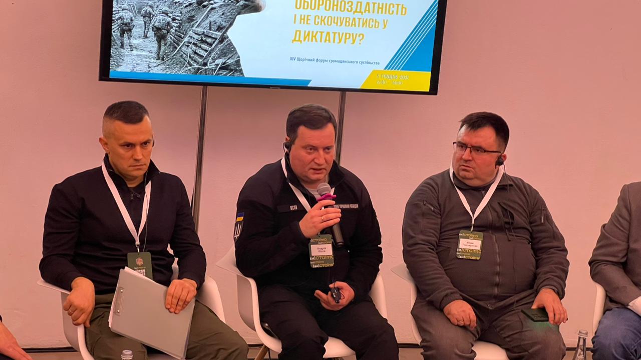 У Києві, 5 грудня 2025 року, в межах XIV Форуму громадянського суспільства, що організований ІСАР «Єднання», відбулася панельна дискусія під назвою «Оборонна демократія: як нам підтримувати обороноздатність і не скочуватись у диктатуру?». Захід, який провели Український безпековий клуб та Фонд сприяння демократії, зібрав представників державних органів, науковців, громадських активістів і військових — усіх, кого хвилює питання, як мобілізувати суспільство задля перемоги, зберігаючи демократичні цінності.