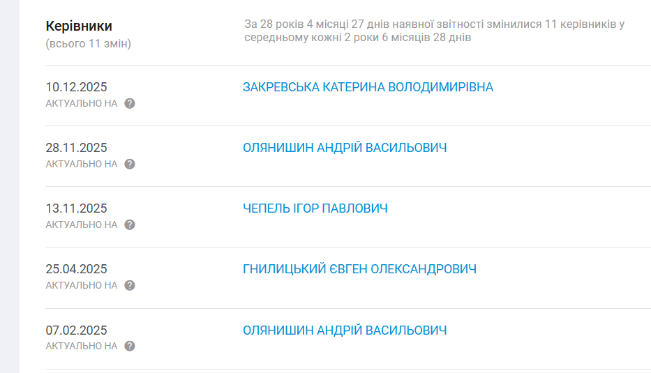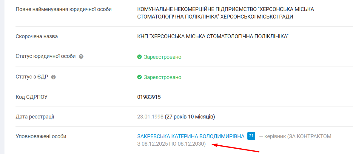 Отже, за даними системи YouControl, Катерина Закревська має контракт на 5 років: до 8 грудня 2030 року. Примітно, що не в усіх медичних закладах Херсона очільники саме за контрактом — є тимчасові покладання обов’язків. Ймовірно на них також чекає зміна керівників.