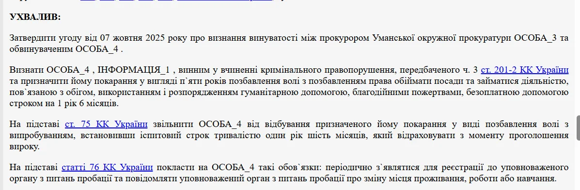 У тексті вироку йдеться, що прокурор та обвинувачений уклали угоду про визнання винуватості за ч. 3 ст. 201–2 (незаконне використання з метою отримання прибутку гуманітарної допомоги) ККУ. Вони домовилися про п’ять років ув’язнення й рік і шість місяців позбавлення права займатися діяльністю, пов‘язаною з гуманітарною допомогою. Цей вирок, згідно зі ст. 75 та укладеною угодою, замінили на рік і шість місяців іспитового терміну.