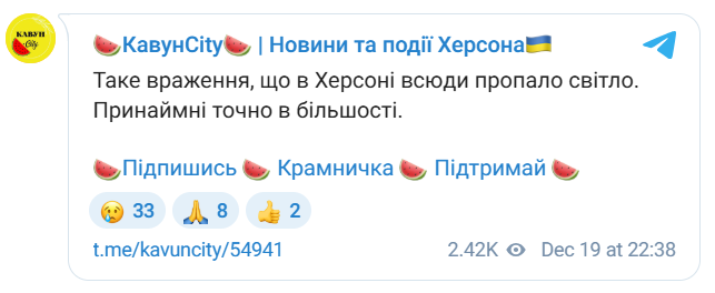 В Херсоні про відсутність світла коротко о 22.50 (19 грудня) повідомив начальник МВА Шанько — після того, як за 12 хвилин до цього написали кореспонденти Кавун.City. З тих пір — жодних додаткових публічних повідомлень щодо світла.