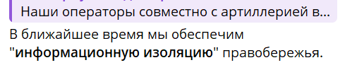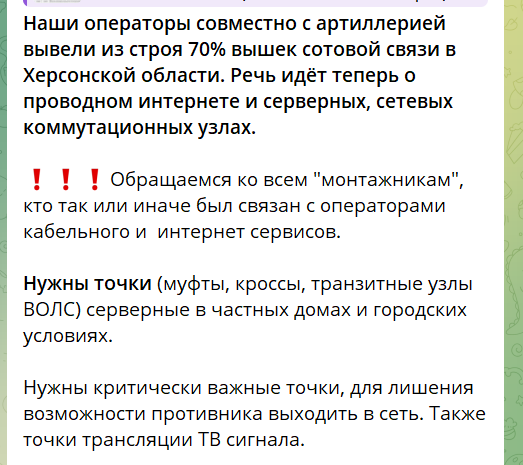 У повідомленнях йдеться про нібито виведення з ладу до 70% вишок стільникового зв’язку на території Херсонської області. Далі росіяни прямо заявляють, що їхні наступні дії будуть спрямовані не лише проти мобільного зв’язку, а й проти проводового інтернету, серверних приміщень і мережевих комутаційних вузлів.