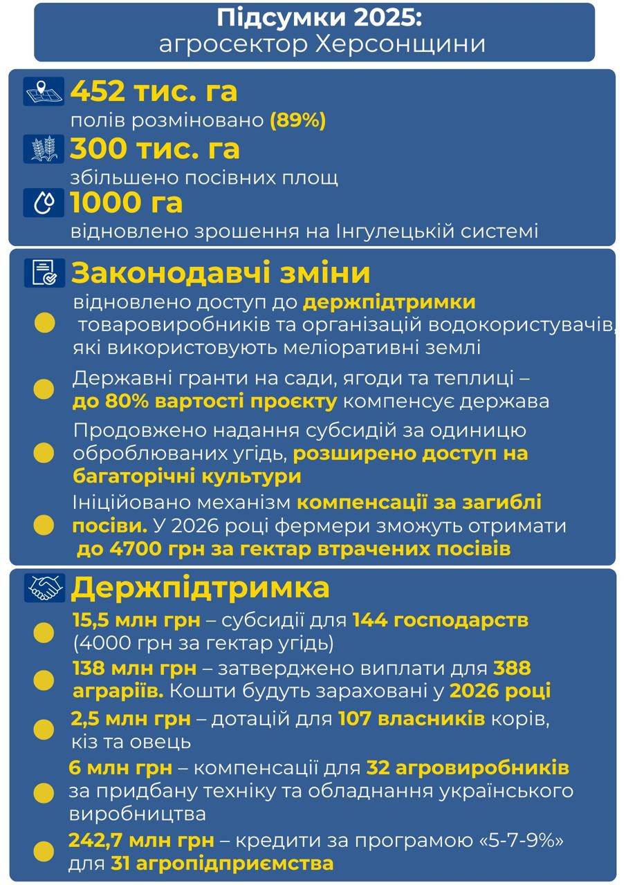 Для підтримки аграріїв у цих складних умовах держава реалізує низку програм. Зокрема, виробники Херсонщини отримують грантову підтримку на закладання садів і будівництво теплиць, користуються програмою пільгового кредитування «Доступні кредити 5–7–9%» (зокрема під 3% річних для поповнення обігових коштів та інвестицій), а також іншими інструментами фінансової та консультаційної допомоги. Ці заходи спрямовані на збереження та відновлення аграрного виробництва, підтримку економіки регіону й зміцнення віри в майбутнє.