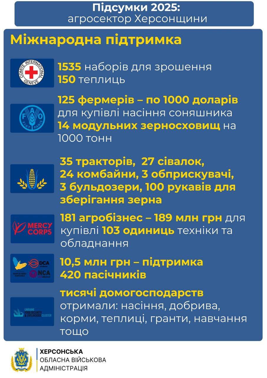 Аграріїї Херсонщини мають міжнародну підтримку, яка у 2025 році зосереджена: на відновленні після обстрілів, допомозі від ФАО (обладнання); продовженні грантових програм; фінансуванні від міжнародних організацій через державний бюджет (загалом 43% коштів на аграріїв). А також партнерстві з країнами-донорами – як-то Швеція та Литва, для гуманітарної допомоги, розмінування та розвитку сталого сільського господарства на деокупованих землях, з акцентом на прифронтові території та відновлення зрошення.