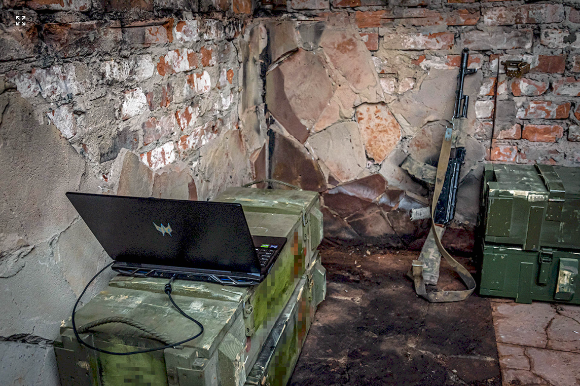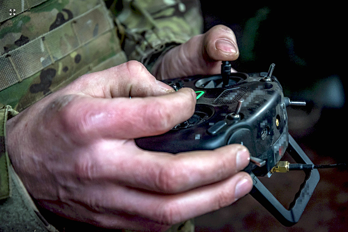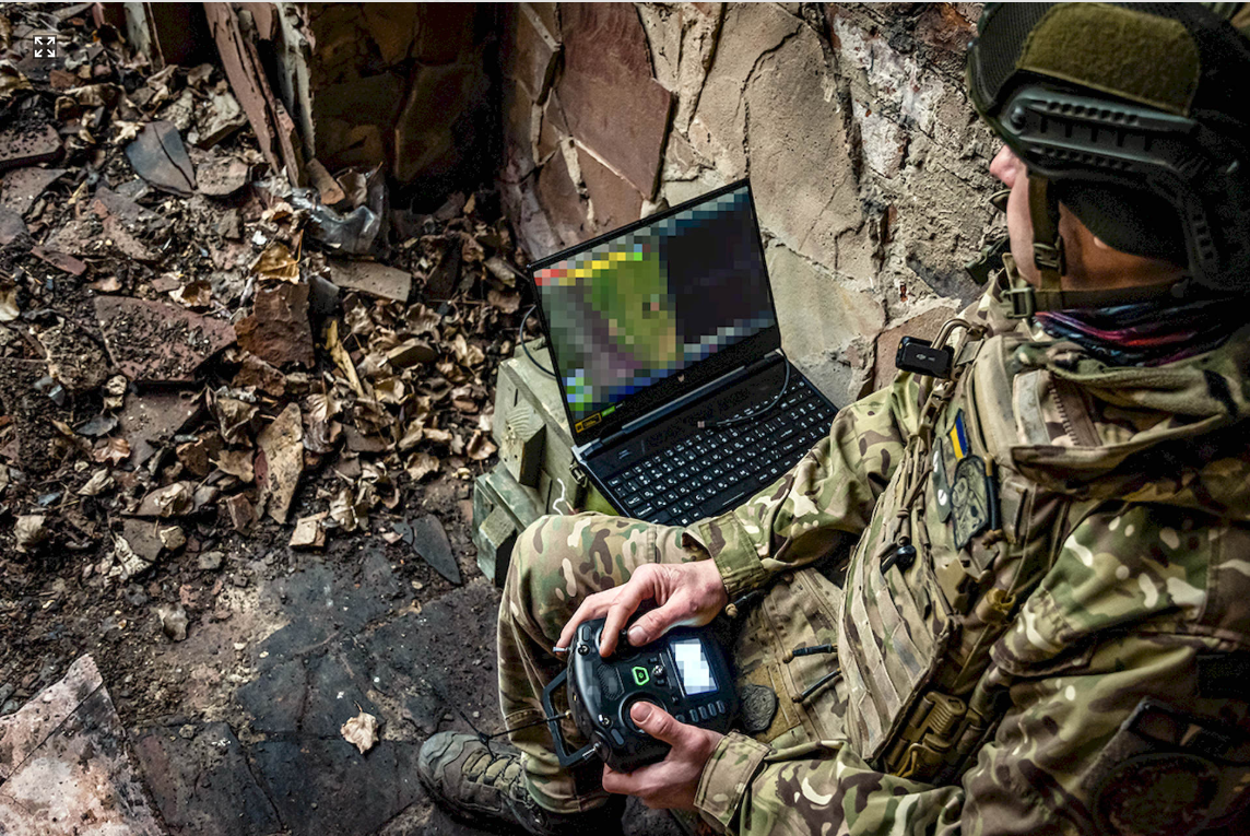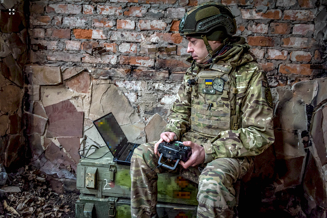 «Зараз я намагаюся перемикнути його на радіоуправління, а до цього він був підключений на управління з ноутбука», — пояснює військовослужбовець 5-ї Слобожанської бригади «Скіф» НГУ з позивним «Грей».