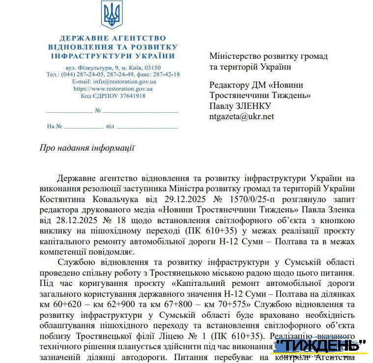 Аби з`ясувати, наскільки це можливо, медіа направило запит до Міністра розвитку громад і територій п.Кулеби з описом проблеми. Міністр дав доручення Державному агентству відновлення та розвитку інфраструктури України вивчити питання. І ось на початку січня медіа отримало відповідь – від голови державного Агентства Сергія Сухомлина. Він повідомив, що їхнім обласним структурним підрозділом – Службою відновлення було проведено спільну роботу з Тростянецькою міською радою щодо питання встановлення регульованого світлофору. Проєктантами було скориговано проєкт “Капітальний ремонт автомобільної дороги загального користування державного значення Н-12 Суми – Полтава на ділянках км 60+620 – км 62+900 та км 67+800 – км 70+575”, де і було враховано необхідність облаштування пішохідного переходу біля освітнього закладу – Тростянецької філії ліцею №1. Реалізацію вказаного технічного рішення здійснить підрядна організація, яка веде капремонт дороги.