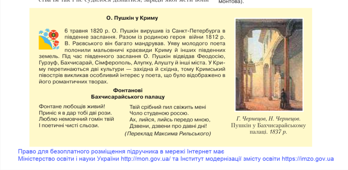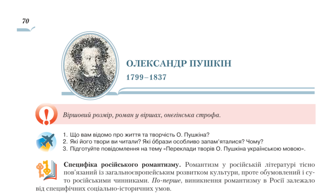 Ось лише один із прикладів присутності Пушкіна в підручнику з зарубіжної літератури, виданого у Києві 2017 року. Власне Пушікіна, Лермонтова, Цвєтаєву та інших російських письменників вивчали в Україні до 2022 року і не змінювали їхніх прізвищ.