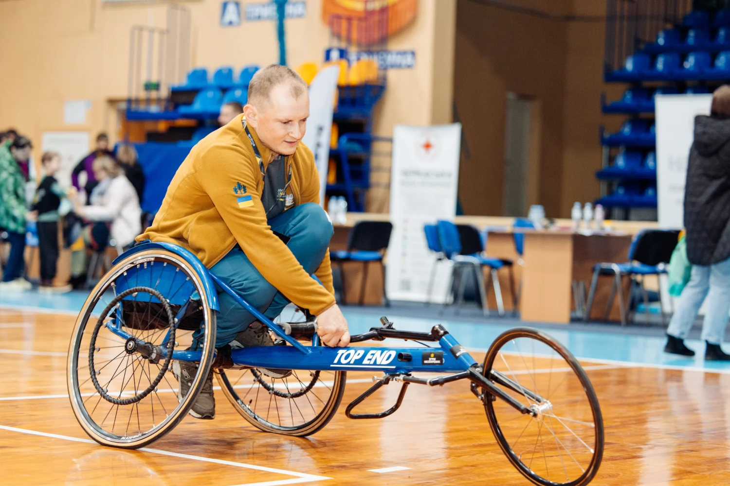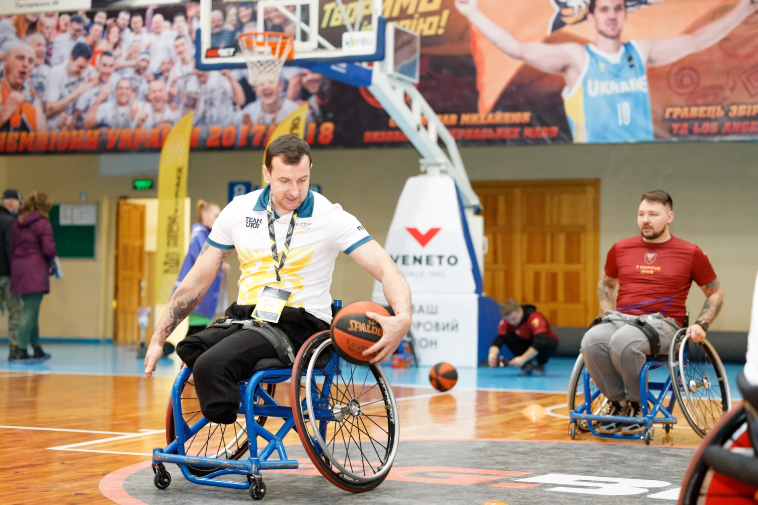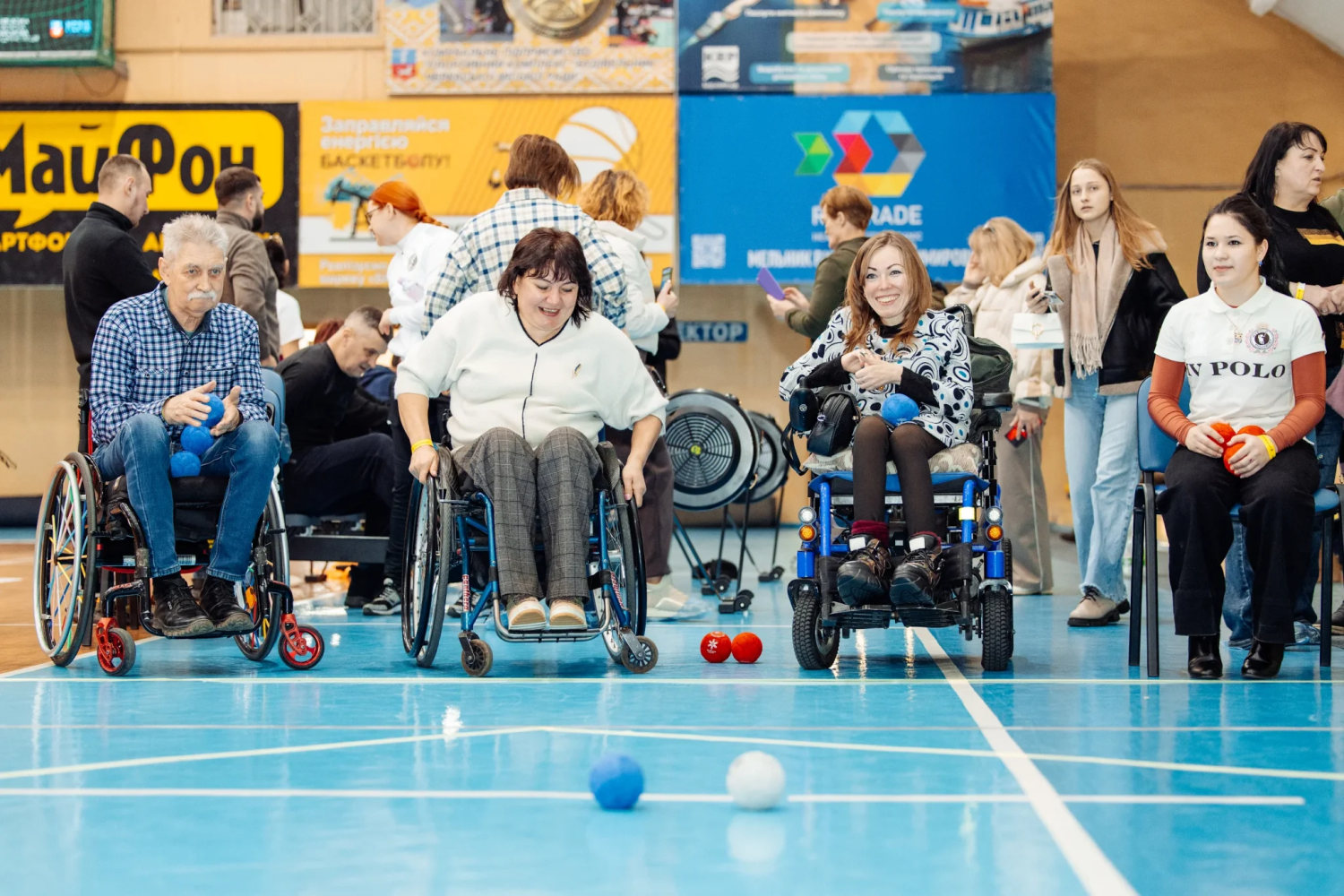 Їх двоє у чорному: один у футболці, а інший – у худі. Молодий чоловік пасує іншому біло‐червоний волейбольний м’яч, другий його ловить і віддає. Так вони зі сміхом перетинають спортзал, штовхаючи крісла колісні: великі колеса розташовані під кутом, а також позаду є додаткова пара – це вирізняє адаптивні крісла. М’яч робить дугу в повітрі, але один із гравців не встигає його спіймати. Тож м’яч котиться натертою до блиску лакованою підлогою, яка імітує дерево, до моїх ніг. Я повертаю його чоловікам, а сама продовжую слідкувати за спортивною грою бочче. У ній команди по черзі кидають червоний та синій м’ячі до сірого посередині поля, аби перемогти.