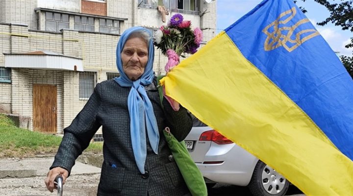 Старша жінка з Херсонщини розчулила мережу на День прапора синьо-жовтим стягом і шкарпетками