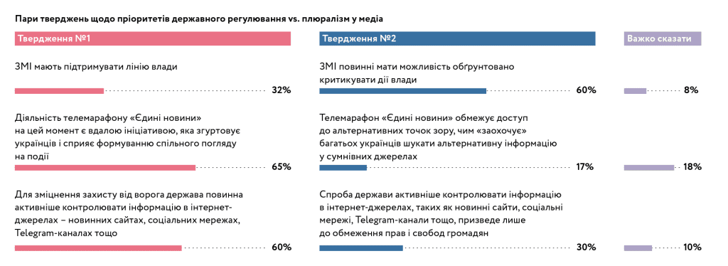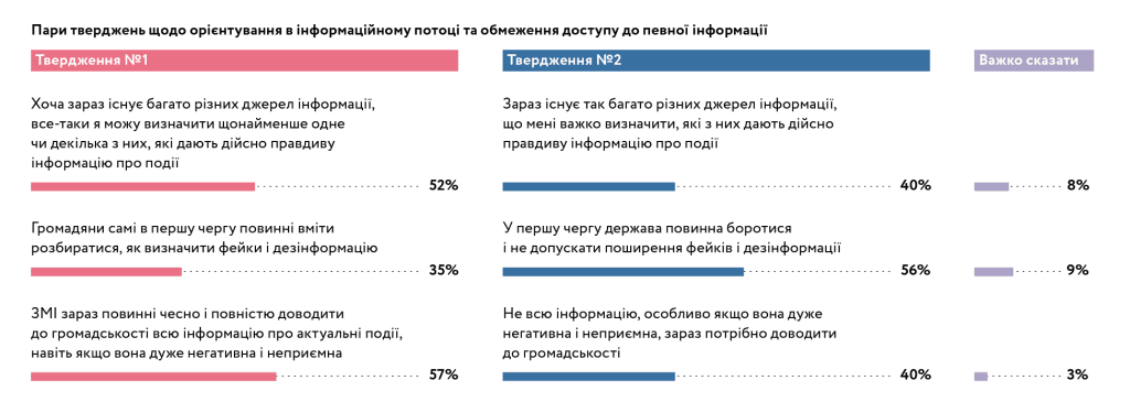 These results clearly demonstrate that freedom of speech is an important value for Ukrainians. However, understanding the situation in the country and facing the manifestations of Russian propaganda, citizens want the state to perform some of the content filtering functions for them (although more than 50% of citizens consider themselves capable of distinguishing fake from truth).