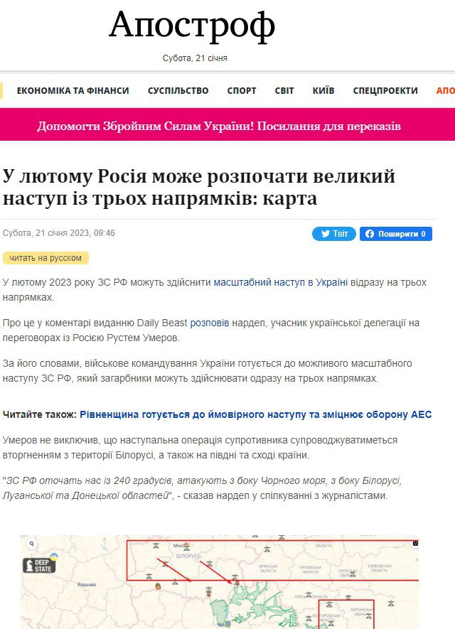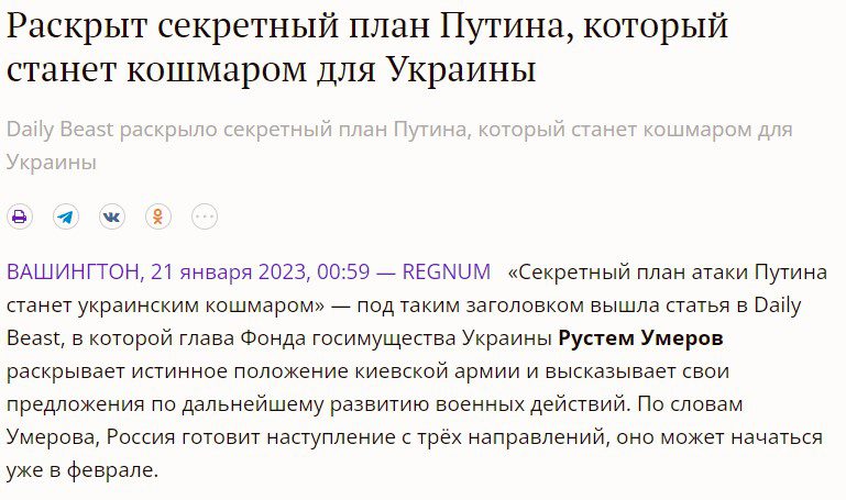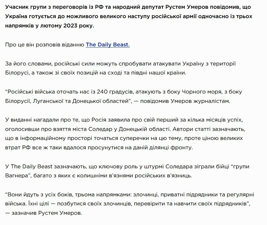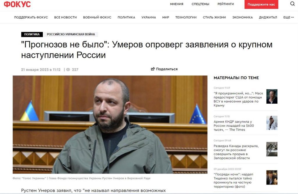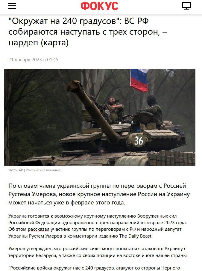 This morning, some Ukrainian media outlets began to report that that “a member of the negotiating group with Russia and MP Rustem Umerov said that Ukraine is preparing for a possible major offensive of the Russian army simultaneously from three directions in February 2023“. Since Rustem Umerov himself denied that he had said such a thing, and we noticed the spread of this fake as early as midnight on Russian telegram channels – We are publishing a short study on why this is fake and how Russia managed to deceive some Ukrainian media.
