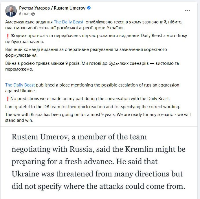 At the same time , at the time of the publication on some Ukrainian websites, Rustem Umerov’s official page had already published a refutation several hours earlier.