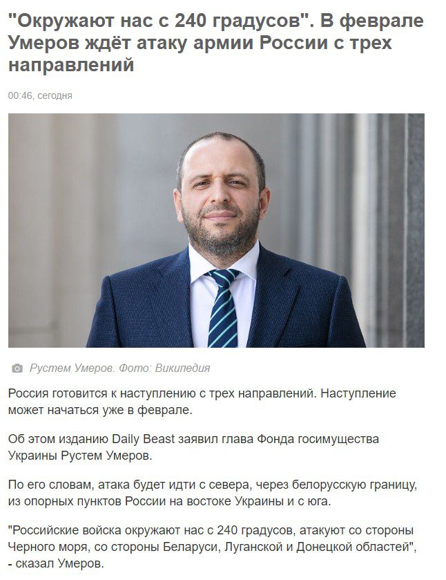 The article states that Rustem Umerov allegedly said, that “Russian troops will surround us from 240 degrees, attacking from the Black Sea, Belarus, Luhansk and Donetsk regions”. At the same time , it is strongly emphasized that he belongs to the government and is the head of the State Property Fund of Ukraine.