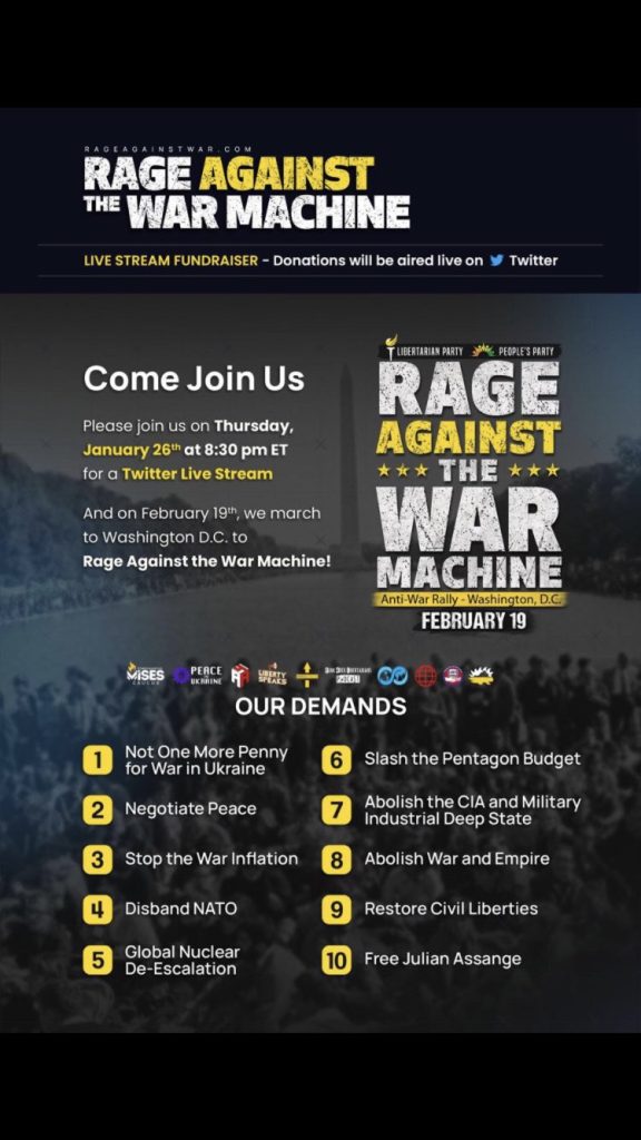Returning to the Rage Against the War Machine march. The demands of the march are absolutely ridiculous and completely betray these “peacekeepers” as Russian agents. The demands include not a single penny to Ukraine, the dissolution of NATO and the CIA, cuts to the Pentagon’s budget, and more.