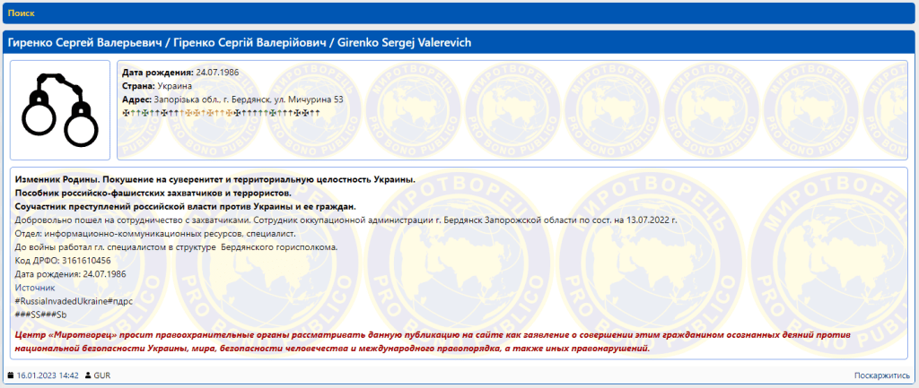 The traitor Gyrenko Serhiy Before defecting to the enemy, he worked in the Berdiansk Executive Committee as an ordinary specialist in the Department of Information and Communication Resources. After the occupation of the city, he was one of the first to work for the occupier, sharing pro-Russian views. He actively agitated other employees of the executive committee to go to work for the occupiers. He threatened and betrayed his own.