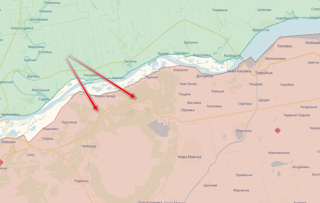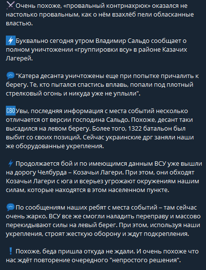 A little earlier, similar information was disseminated in Russian publics, which claimed that “The battle continues and according to the available information, the Ukrainian Armed Forces have already reached the Chelburna – Kozachi Lageri road. At the same time, they are bypassing Kozachi Lageri from the south and seriously threaten to encircle our forces in this settlement“.