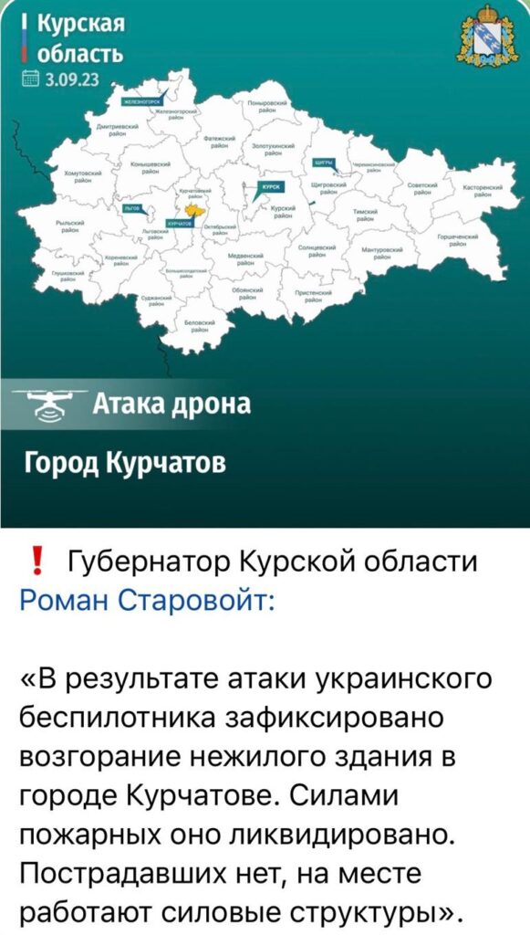 On the evening of Sunday, September 3, an unmanned aerial vehicle struck an FSB building in the city of Kurchatov, Kursk region of Russia. The impact damaged the roof and started a fire.