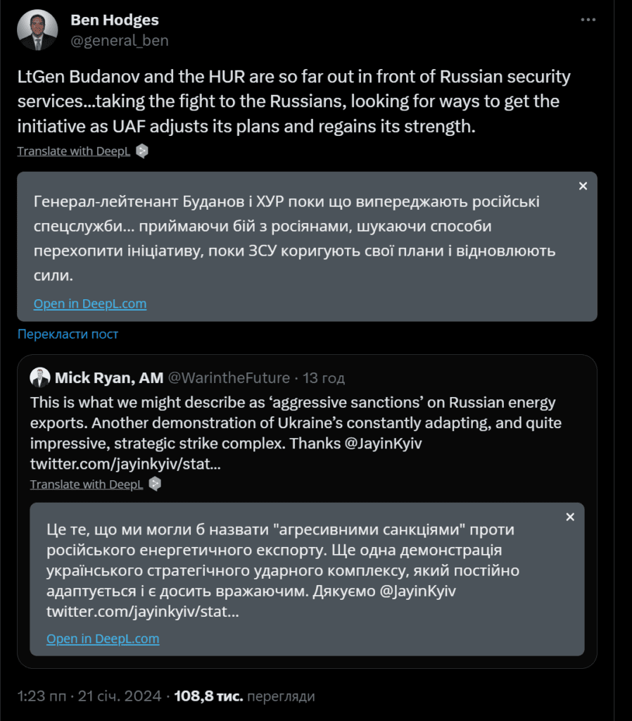 “Lieutenant General Budanov and the GUR are still ahead of the Russian intelligence services… taking the fight to the Russians, looking for ways to seize the initiative while the Ukrainian Armed Forces adjust their plans and rebuild their forces,” said Ben Hodges, former commander of the US Army in Europe and head of the Pershing Chair in Strategic Studies.