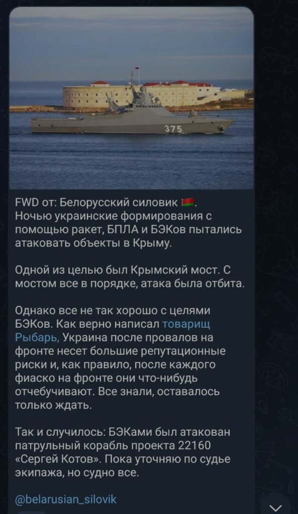 During a combined attack on Crimea, the patrol ship Sergei Kotov (Vasily Bykov project) of the Russian Black Sea Fleet was hit by unmanned maritime strike drones near Feodosia.