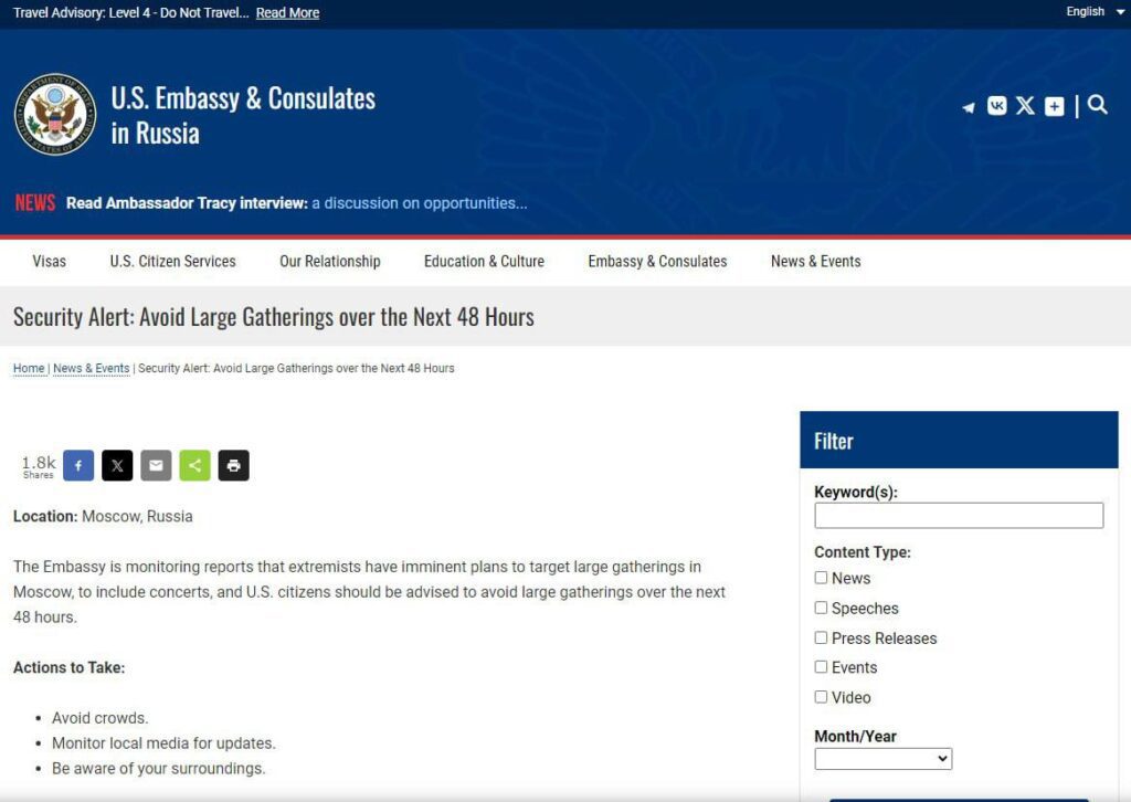 The next important point is the constant appeal to the warning from the US and UK embassies, which in early March urged their citizens in Russia to avoid crowded places, including concerts. This was cited as evidence of involvement.