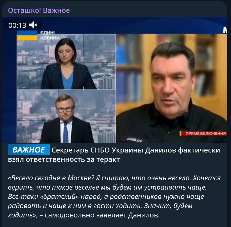 However, despite this, in the first hours, most of the channels affiliated with the Russian special services and ordinary propagandists spread the version of the involvement of Ukraine and its special services (they called the SBU and the GUR) as widely as possible. In other words, without any facts, contrary to the description from witnesses and footage from numerous videos, the “perpetrators were identified” and immediate and severe punishment was demanded.