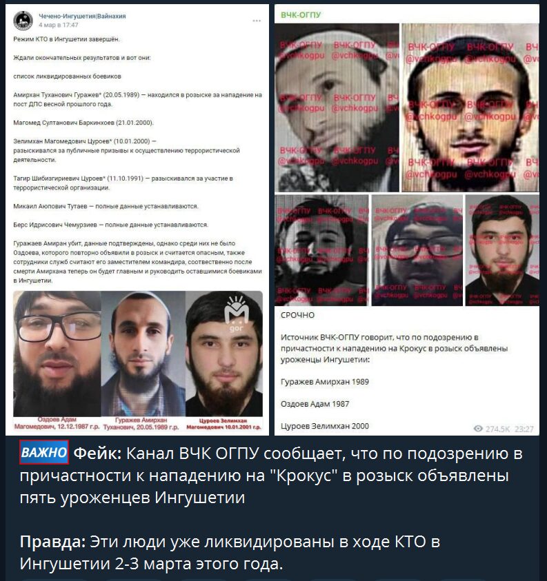 Then there was a strange throw-in from telegram channels affiliated with the Russian special services, which published allegedly photos of wanted terrorists from Ingushetia, who were identified half an hour later as killed in another operation. This immediately led to the conclusion that Ukraine was covering its tracks. It was not specified how Ukraine could have posted the information on the channel controlled by the Russian special services, however.