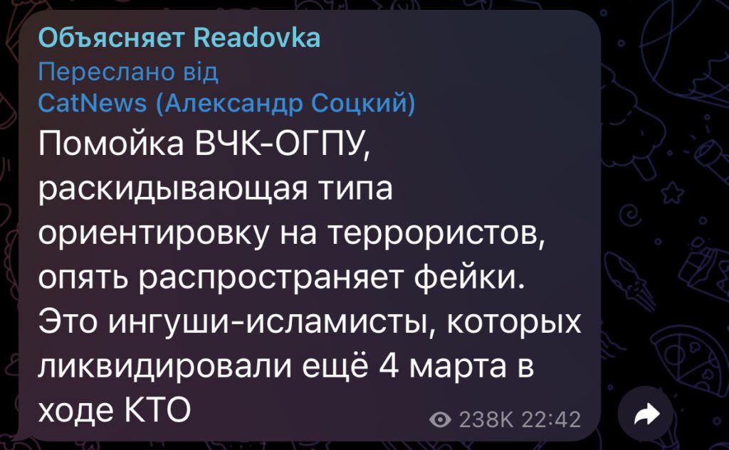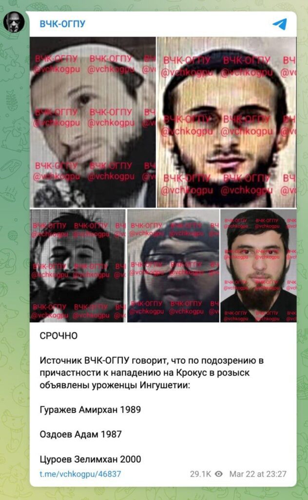 It allegedly shows a post from the Cheka-OGPU telegram channel, which at 23:27 Moscow time (or perhaps other times) published information that residents of Ingushetia were wanted.