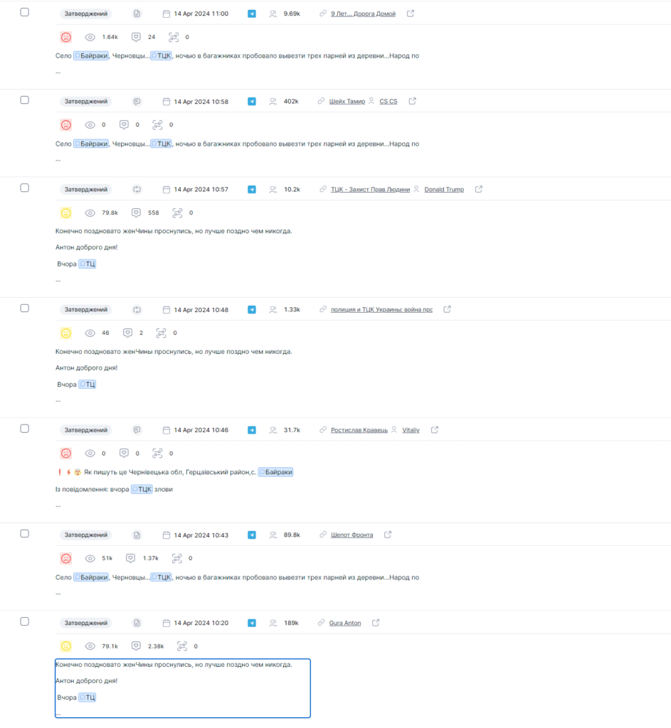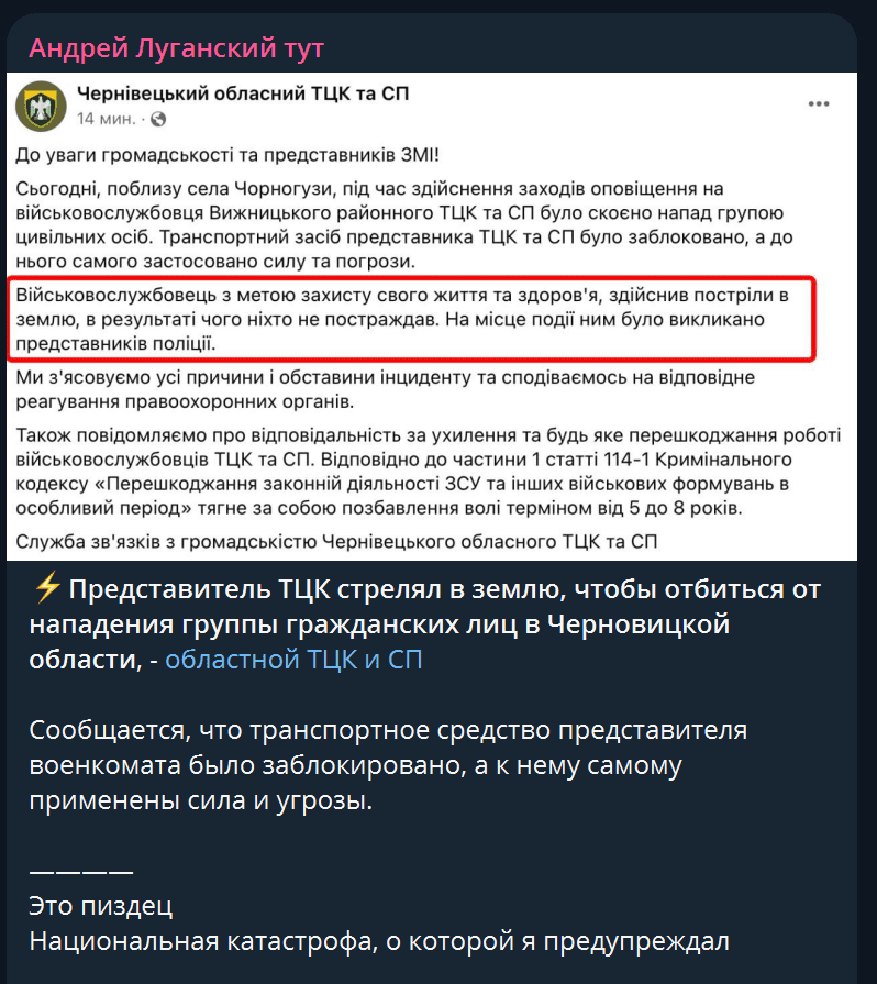 - On April 19, another attack on a TCC representative took place in the Chernivtsi region, near the village of Chornohuzy, when a serviceman of the Vyzhnytsia district TCC was making a warning and was forced to shoot into the ground to fend off an attack by a group of civilians. The events are apparently identical to those in the village of Bayraki.