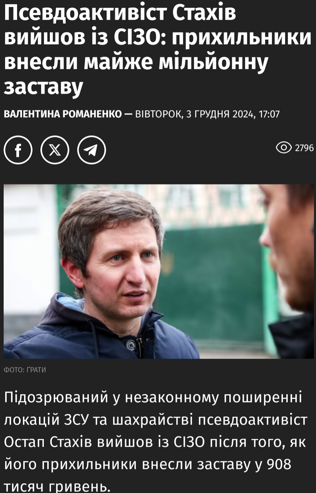 The first high-profile incident was in Berezne, Rivne region, at the end of January 2024. Stakhiv’s group organized a provocation there around the case of a local resident, Vasyl Pleskach, who claimed that TCC employees had illegally detained him and used physical force after serving him with a summons. After Pleskach’s release, Stakhiv’s team launched an active campaign, filing complaints with law enforcement agencies, mobilizing local residents, and organizing violent actions, including an invasion of the SBI building.